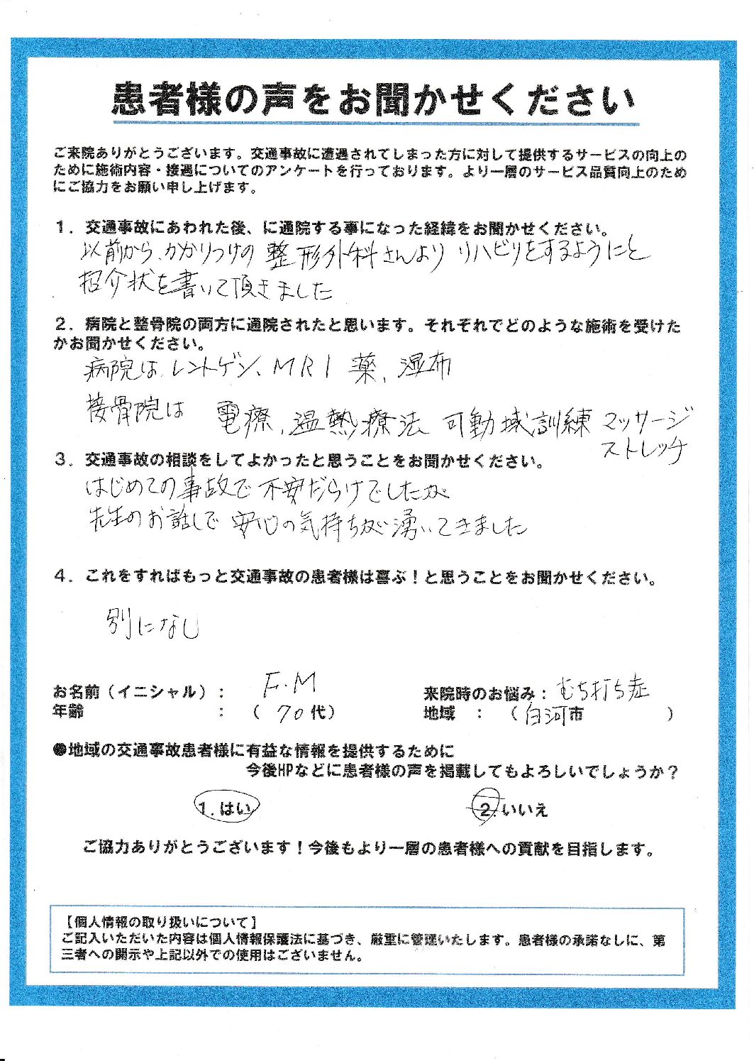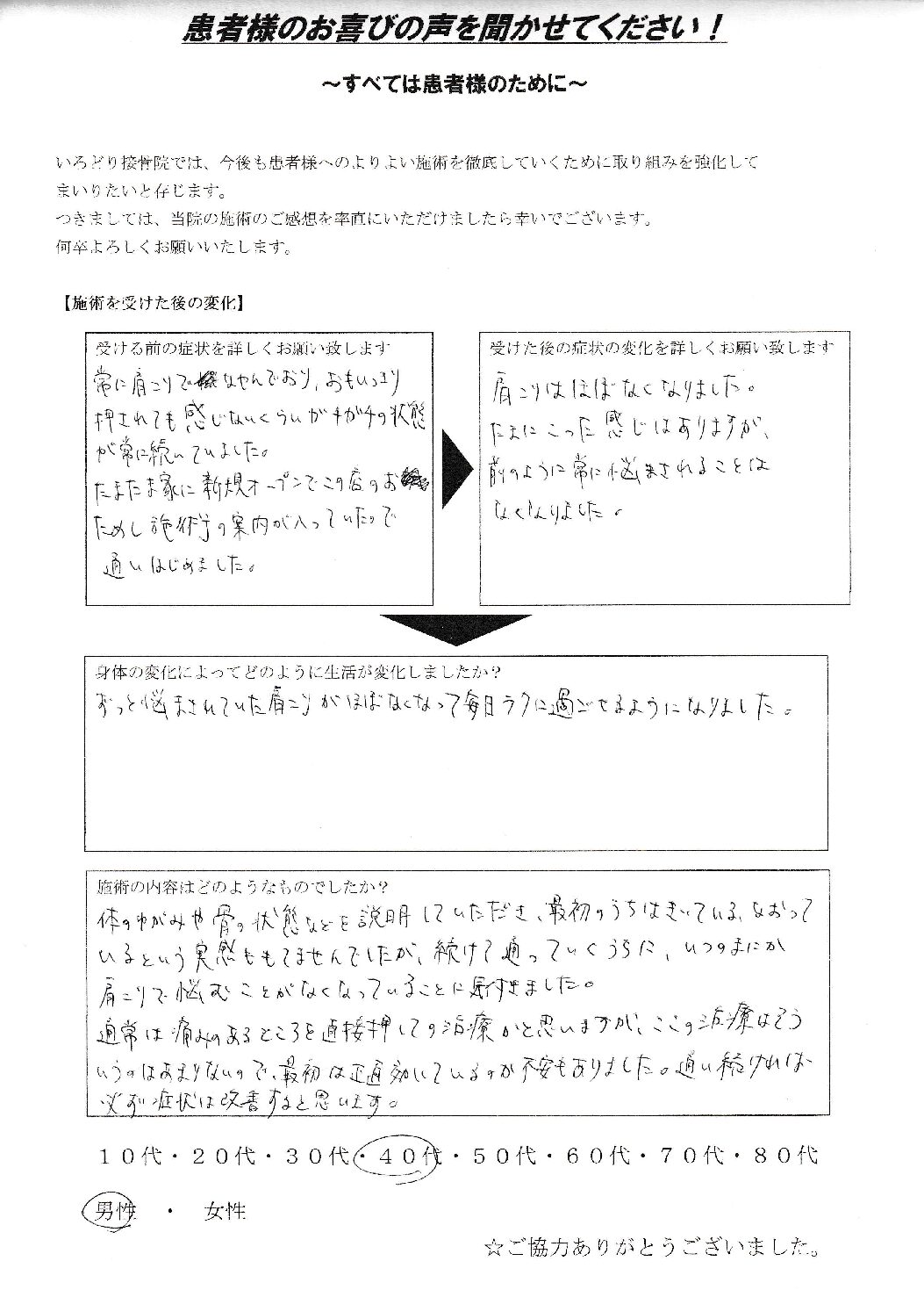 痛み等がなくなり、今後は、予防のための施術をしていただけるということで、痛み等が再発しないように気をつけるとともに、治療から予防とよりそってくださり、ありがとうございました。今後ともお世話になります。