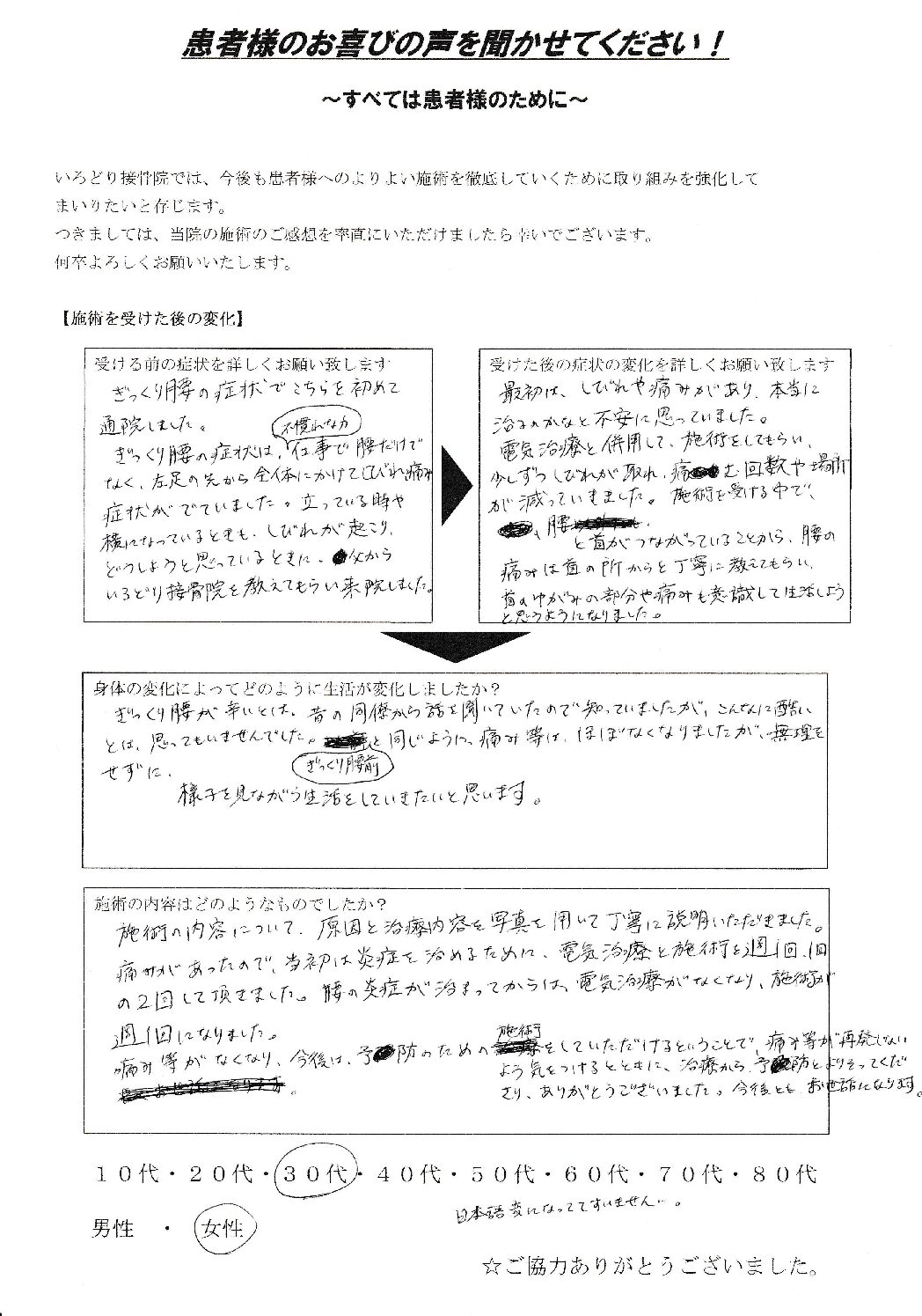 ぎっくり腰の症状でこちらを初めて通院しました。ぎっくり腰の症状は、不慣れな力仕事で腰だけでなく、左足の先から全体にかけてしびれ、痛み症状がでていました。立っている時や横になっているときも、しびれが起こり、どうしようと思っているときに、父からいろどり接骨院を教えてもらい来院しました。