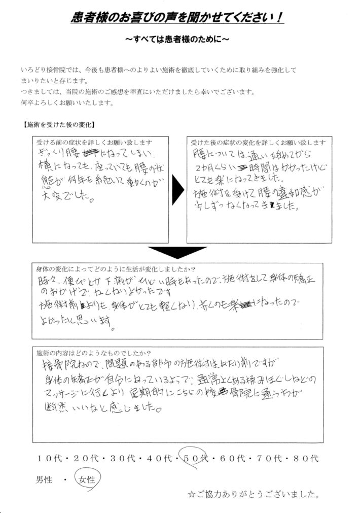 施術を受けて腰の違和感が少しずつなくなってきました。