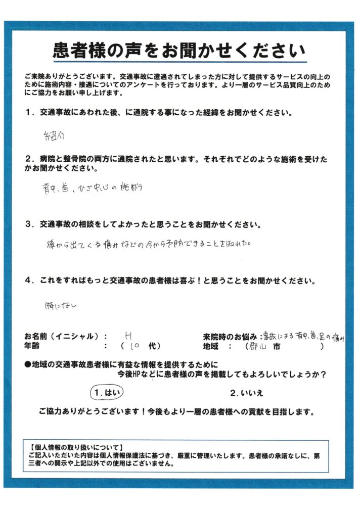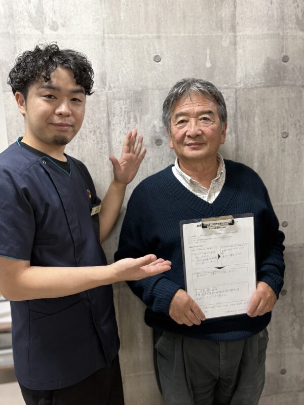 首周りの矯正と、背骨全体の歪みを治すことが中心でした。症状は腰痛なのに何故?と思いましたが、身体全体の歪みを治すことが腰の痛みを軽減するということを教えて下さり、そして実践してくださいました。