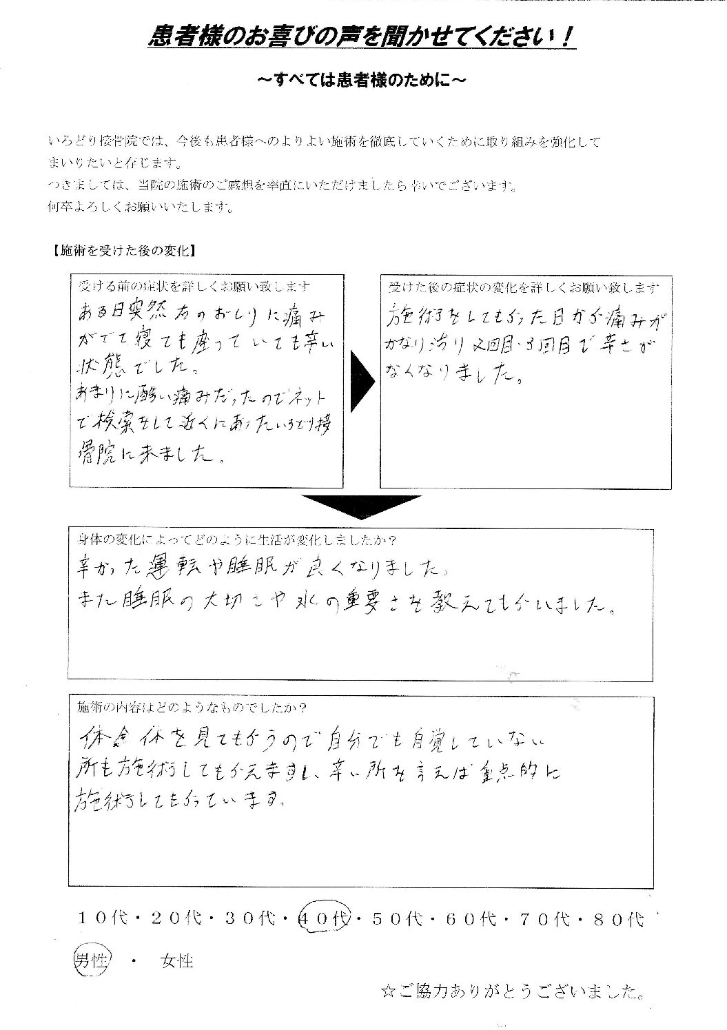 仕事中重いものを持ち上げた際に腰に痛みが走り、その後、少しかがむだけで痛みによりしばらく動けなくなる具合でした。