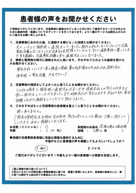 現在、交通事故治療で白河市のしらかわ接骨院に通っている患者様は、病院(整形外科)と併用して当接骨院へ通院しています。一度、白河市のしらかわ接骨院へご相談ください。