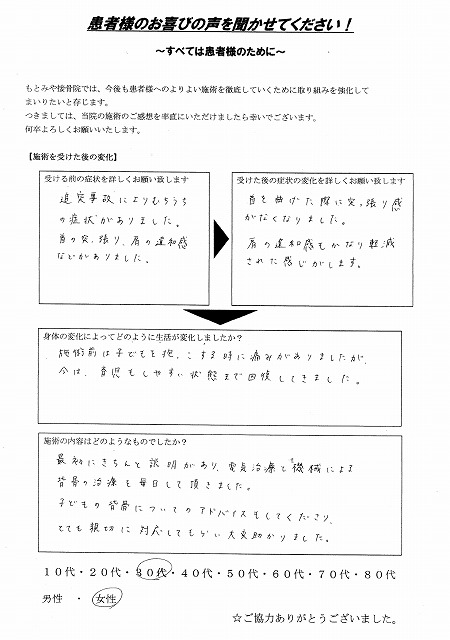 施術前はこどもを抱っこする時に痛みがありましたが、今は、育児もしやすい状態まで回復してきました。