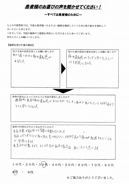 通勤中に首・肩の痛み・違和感がありましたが、少しずつ痛みが無くなっていき、施術前よりとても楽になりました。